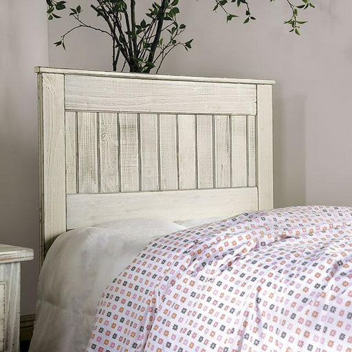 This luscious solid wood headboard is painted in a distressed white finish. The wooden planks along the headboard invite a rustic aura into your be...